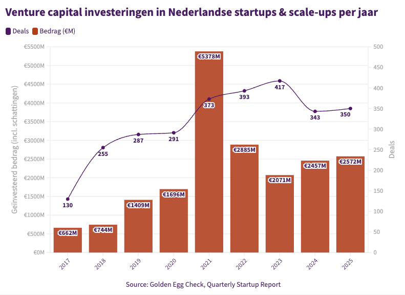 Nederlandse startups en scale-ups hebben in 2025 een totaalbedrag van 2,5 miljard euro aan gepubliceerde investeringen opgehaald. Dat is een stijging van 5,7% ten opzichte van 2024 (2,3 miljard euro). Inclusief schattingen voor niet-gepubliceerde bedragen komt het totaal voor 2025 uit op circa 2,54 miljard euro. Met deze stand is 2025 het op twee na beste jaar ooit, na de recordjaren 2021 (5,4 miljard euro) en 2022 (2,9 miljard euro). Dit blijkt uit de laatste editie van het Quarterly Startup Report, een driemaandelijkse data-analyse van Golden Egg Check, Dealroom.co, KPMG, de Regionale Ontwikkelingsmaatschappijen (ROM’s), Nederlandse Vereniging van Participatiemaatschappijen (NVP), Invest-NL, Techleap en initiatiefnemer Dutch Startup Association (dSa).